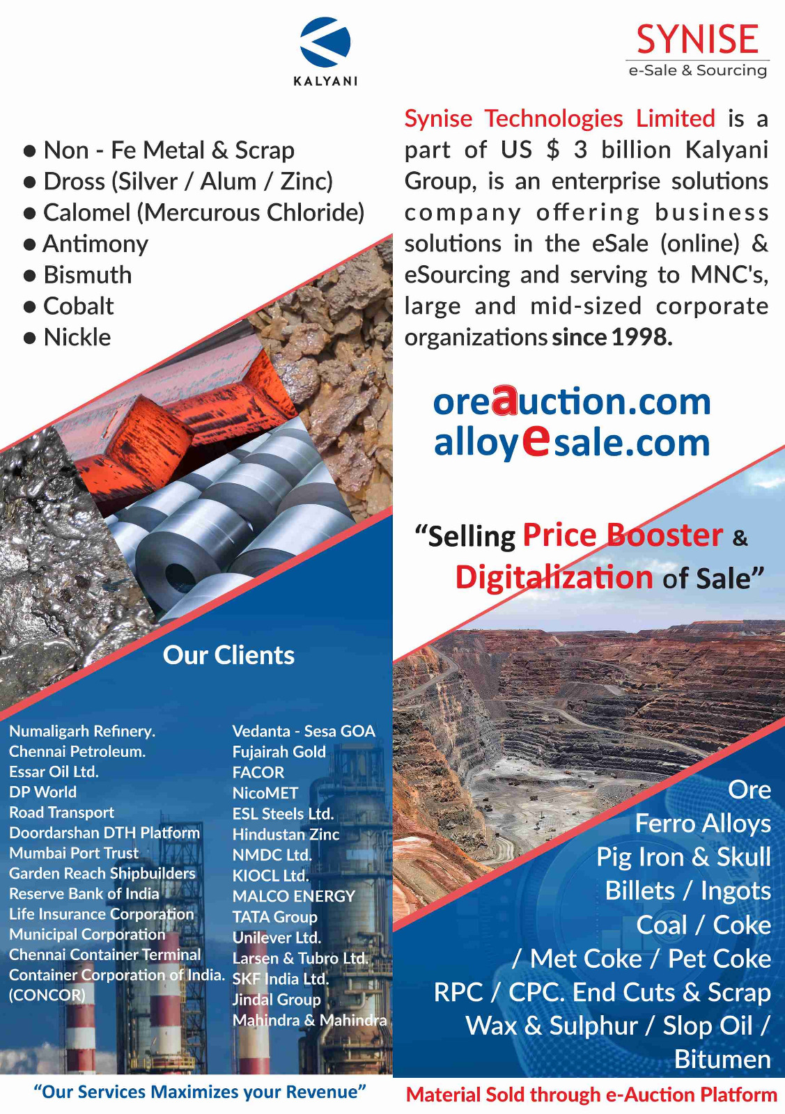 alloyesale.com & oreauction.com are online platforms designed & developed by Synise Technologies Limited to sell mining and base metal products.